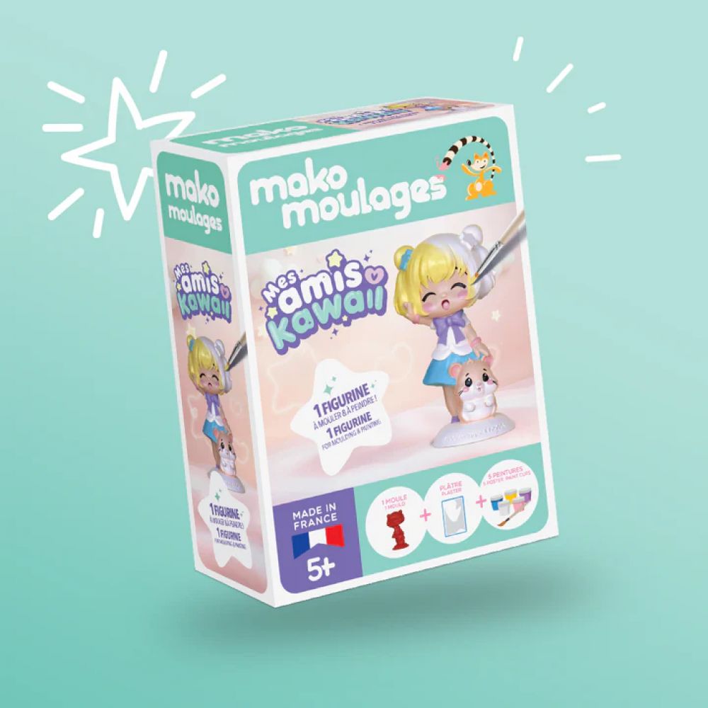 Le kit comprend : 1 moule en latex kawai, 1 sachet de 80g de plâtre, 5 pots de peinture, 4 croisillons, 1 pinceau, 1 notice de jeu.